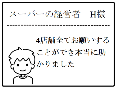 現在、スーパーを4店舗経営しています。清掃については各店舗の店長に任せていて、それぞれ違う清掃業者へ依頼していました。しかし、価格やサービスのばらつきが気になり、1社にまとめようと再提案を各社に依頼しました。